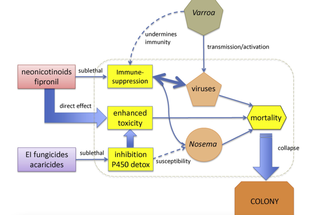 In 2016, an influential article written by Dr. Sanchez-Bayo and colleagues from Australia, the United Kingdom, Italy, Japan and France, synthesized over a decade of studies and convincingly demonstrated that low-level pesticides are the root cause of honey bee loss (Sanchez-Bayo, Francisco. “Are Bee Diseases Linked to Pesticides? – A Brief Review.” Environment international 89-90 (2016): 7–11). Pesticide exposure can directly kill foraging bees, or disable them and make it difficult for them to return to the hive. Pesticides in the hive cause disability, reduced hatching and loss of queen bee functioning. Herbicides reduce the flowering plants and variety of plants that bees can feed on, reducing their nutritional health, as well as bringing the toxins into the hive. The remaining bees are less healthy and so are immune-compromised and more susceptible to viral and other infections and diseases. Pesticides are the culprit of the dramatic and rapid decline of honeybees. Here’s an image from that paper that shows how pesticides interact with other types of stressors to make the outcome worse: