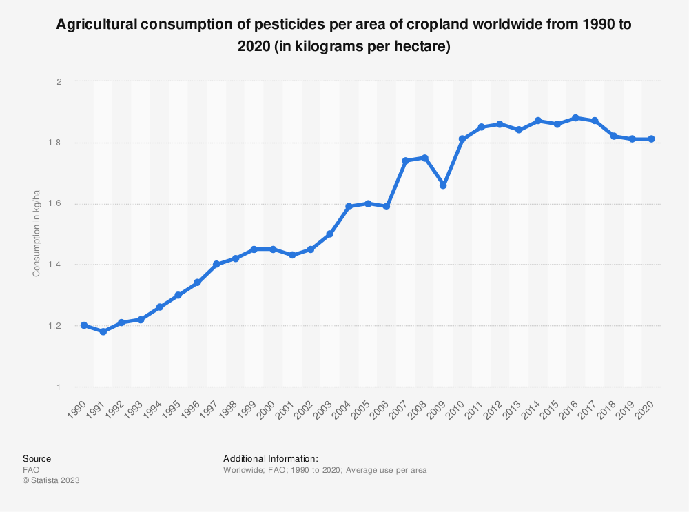 In 2006-7, after reports from Pennsylvania beekeepers of heavy winter losses of hives compared to 25 years prior, commercial beekeepers and hobbyists suspected that perhaps habitat loss (that due to human clearing land for monoculture agriculture or residential areas) led to hive starvation during the winter. Other thoughts were mite infestations or perhaps a virus. A number of scientific studies supported the ideas of virus or mite infestations, leading (unfortunately) to some initiatives among agricultural groups and local governments to treat commercial hives with pesticides to try to kill the mites. Of course, that backfired, and newer studies suggested perhaps the cause was viral infections, or “entombed pollen,” which is pollen that lacks the microbial agents that honeybees treat pollen with to keep it pest-free. There was virtually no mention of pesticides, but that doesn’t mean they weren’t involved. The massive escalation in pesticide use and the new technologies for delivering those pesticides were still pretty new to the scene. The graph below shows the increased use on a global scale.