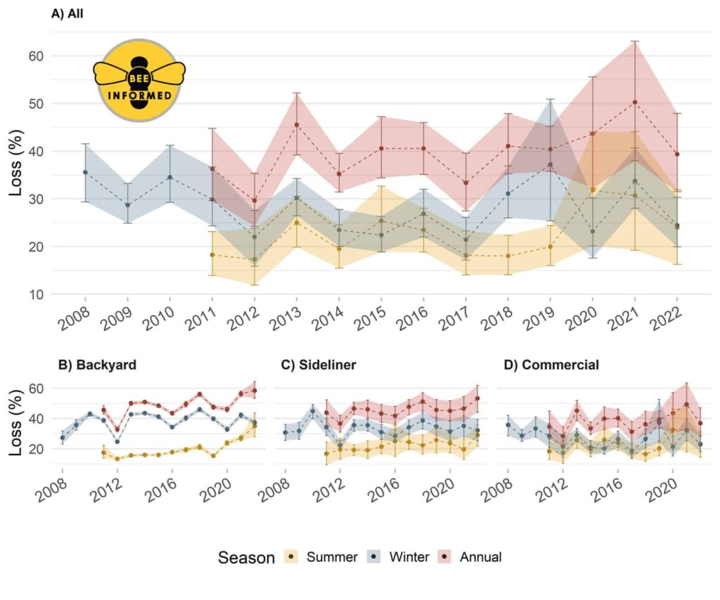 The loss rates overall are pretty high (40-60%) and, you’ll notice, we don’t have data before 2008, and the huge declines and alarm bells began ringing in the early 2000’s. So, basically, we’re looking (in the graph above) at the year by year changes during an overall situation with large colony losses. So, these numbers can be misleading, if not carefully explained. According to the USDA, there were 5 million “managed” colonies in the 1940’s and about half that amount today (despite an enormous expansion of US agriculture). In recent years, there has been an increased demand for commercial honey bees, due in part to the increase in almond production for “milk” and many other products, so beekeepers have been increasing the number of colonies, which will mask losses due to colony collapse disorder.