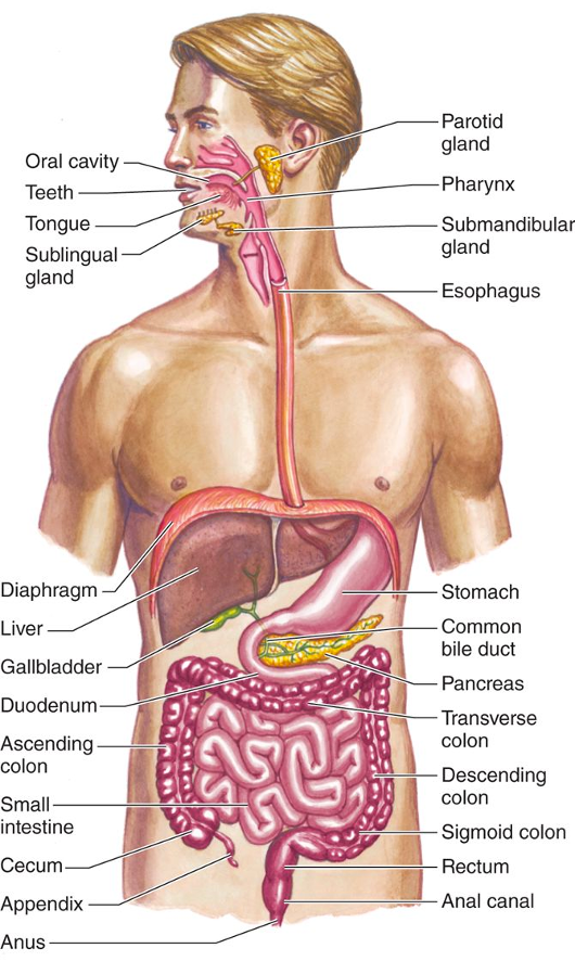 Our bodies are incredible- truly. We eat food and drink various substances and our GI tract digests it into the building blocks that build our bodies. We can think of our bodies as coordinated and collaborating compartments. Our digestive system is basically a long compartmentalized tube. Here’s a picture from the textbook I use in my Human Physiology class. Look at it closely for a few seconds. Notice that the GI system is organized into different regions in an overall self-contained compartment that is open to the outside world at the mouth and the anus, but is separated from the rest of the body compartments (blood, bones, skin, etc).