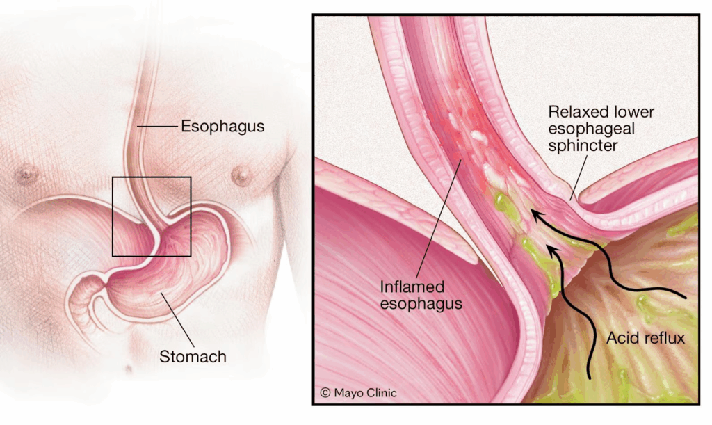We chew our food and mash it up, mixing it with our water-based saliva. Then, we swallow and the paste travels down our esophagus, which is about 10 inches long, to the stomach. The stomach starts oozing cups of concentrated hydrochloric acid (about 8 cups a day) and churning to mix it all together. The stomach contents’ pH drops to about 2. This wicked acid level is crucial for protecting us from many of the contaminants in our food, like plant toxins or bacteria. There’s an enzyme made by stomach cells, pepsin, that needs this acid environment to break apart proteins. The stomach acid is confined to the stomach and the stomach lining itself is coated with a super thick layer of mucus, to protect it from the acid. Some people have a weakness in the ring of muscle that separates the esophagus from the stomach and, when the stomach really gets churning, some of the acid-rich material spurts backwards, causing a heartburn condition called GERD (gastroesophageal reflux disease), or acid reflux.