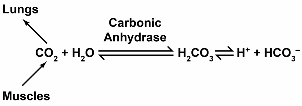 Here’s a helpful picture of how carbon dioxide is transported in the blood (as bicarbonate, HCO3–) from tissue (like a muscle) to lungs. The pic is from https://www.geeksforgeeks.org/biology/transport-of-carbon-dioxide-in-the-blood/.