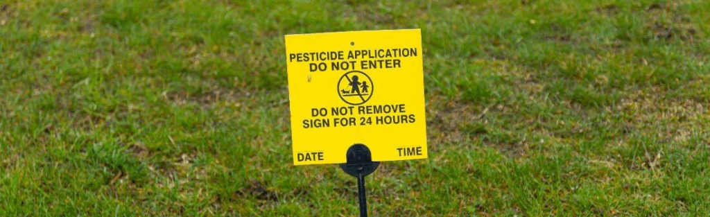 Here’s a specific example. When pesticides are sprayed on someone’s yard (or a school play yard) in NY State, these little yellow signs must be posted: