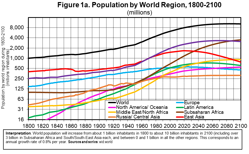 This expanded curve makes it look like a slower increase, but it’s still exponential. If you look at the red curve, for East Asia, you’ll see a decrease in the rate of increase in population size from 1970 to almost no increase around 2020. That reflects the one-child policy in China, with a big decrease in birth rate, along with a death rate that was not changed from before. The fall off in population numbers for East Asia after 2040 is a prediction if there’s no change in the birth/immigration and the larger, older, population from before the one-child policy begin to die. With China now encouraging more births, that prediction may not hold up.
