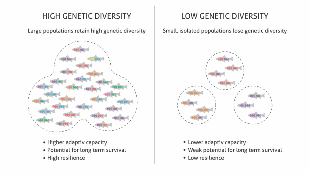 A population is the number of individuals of the same species living at any time in a particular area. Each individual has its own particular combination of traits and, together, the population has a level of genetic diversity through mating (if the organism is a sexually reproducing organism), gene flow like immigration, and mutation rate. Populations need genetic diversity to enable it (the population overall) to withstand challenges like famine or increased temperatures. For example, some individuals might be better able to eat hard seeds (because of tougher beaks or teeth, for example) than others and, if the population’s food supply become dominated by hard seeds, those are the ones whose offspring survive. Populations that get too small have less genetic diversity, so are vulnerable to being wiped out because they cannot survive sudden environmental change. That’s one big reason why biologists are worried about the huge declines in animal and plant populations from pesticide use and deforestation, for example. If all the populations of a species get too low, the species is at risk of extinction.