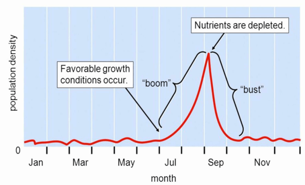 A population’s size is increased through births or immigration from other populations of the same organism. A population’s size decreases as a result of deaths (from predation or disease) or emigration, where deaths/emigration exceed births/immigration. If a population gets too big, the environment might not have sufficient food, water or shelter and the numbers will fall because of increased deaths or emigration or decreased births. Some organism populations go through regular “boom and bust” cycles, never really being at a stable, sustainable level. Others seem more stable and balanced where the births/immigration is balanced by the deaths/emigration. Stability of population size also depends on things like predators or natural disasters like floods, and the other organisms that are part of the overall ecosystem where that population lives. For example, if the insect populations in an area are plummeting, then the birds and others that depend on those insects for food will also suffer population decline.