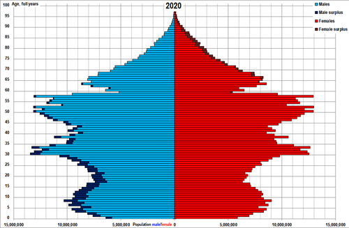This next one is China’s demographic profile from 2020 (source: Wikipedia). Right now the workers are the largest group (like in the US). You can see the effect of China’s one-child policy that ran from 1979 (folks currently in their 40’s and younger) to 2015. The Chinese government is concerned that, as the current workers age and then dominate the older age brackets, the number of younger workers is lower than the number of older adults, meaning fewer workers to support a larger group of older folks. But, that’s a necessary stage for a population to go through, in order to achieve, ultimately (in 80 years or so), a stable population that’s manageable. That was China’s goal back 40 years ago. Unfortunately, China is freaking out and reversing course, rather than waiting it out.