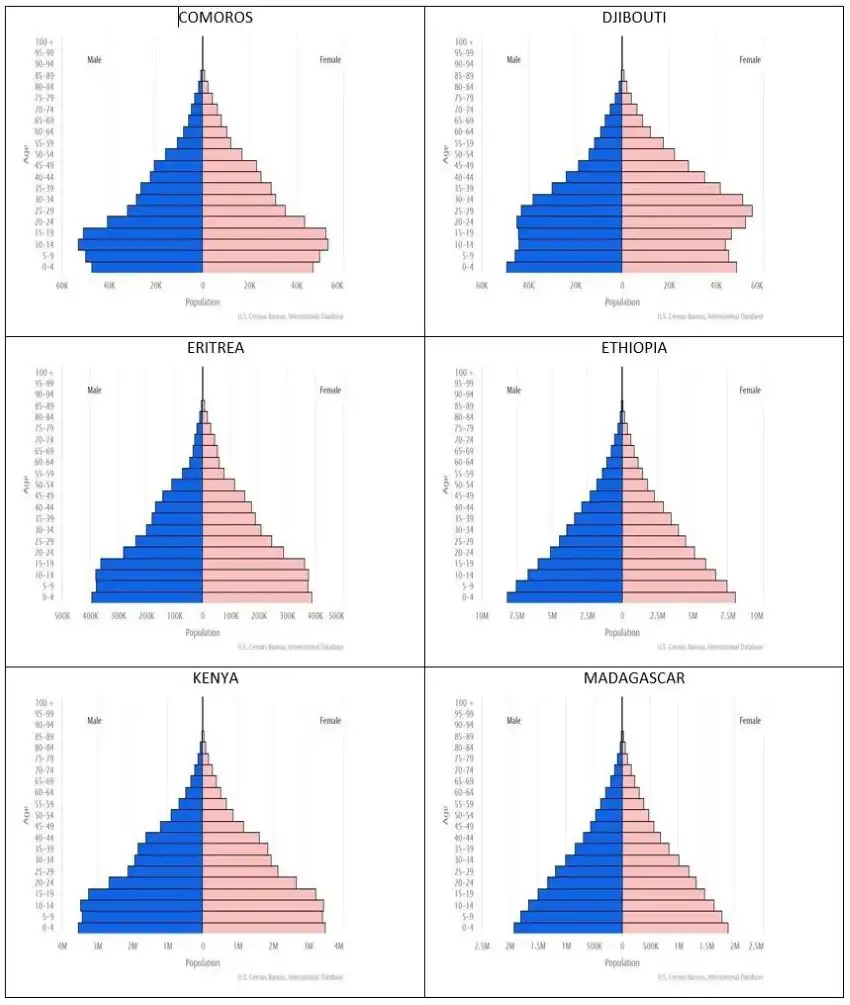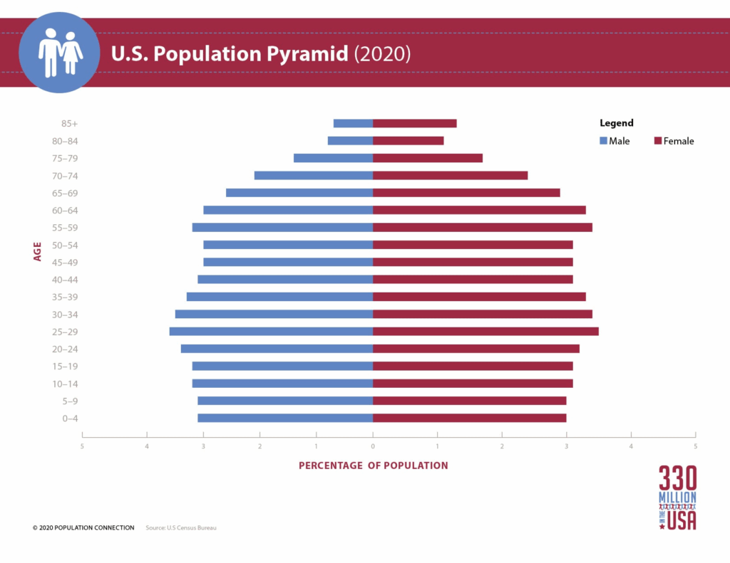 The chart above, from 2020, is of the overall US population’s age structure. You see that it’s, overall, pretty columnar for the age ranges of folks in their 20’s through their 40’s. These are people who are of child-bearing age and are wage-earners. A pretty healthy age distribution, where the working adults can support the older folks and the young. The concern is what will happen when those smaller groups of young folks become the workers, trying to support a larger aged population, which is one reason for all the doom and gloom about social security benefits running out. One way to address this could also be immigration from places in the world where survival is challenging. But, the current state of tribalism in the US complicates things quite a bit.