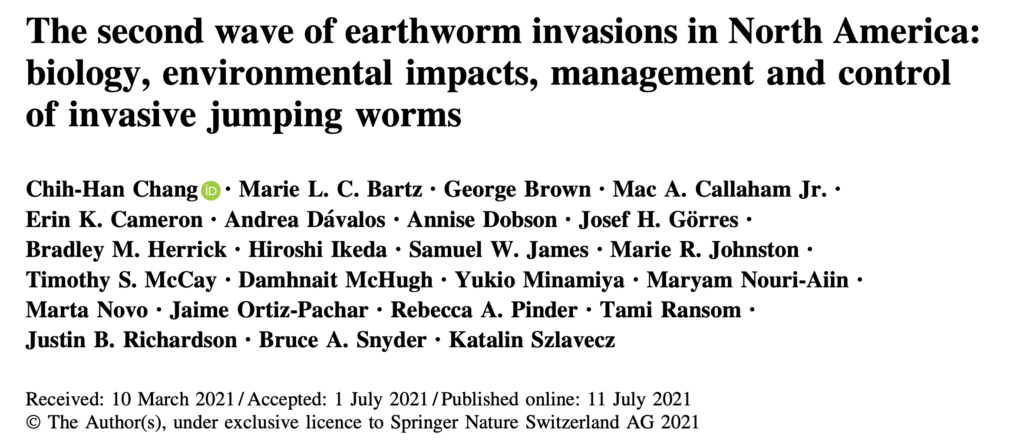 Basically, jumping worms are increasing in abundance, particularly in human dominated habitats like urban parks, suburban developments and the small bits of forest on the edges of developed areas. The cocoons and even adults run off with rains, flowing across land and into wetland areas near streams. They get transported by landscapers that collect, remove and mulch leaves for composting. The increasing winter temperatures, leading to more frost-free days, are favoring their march northward. A lot of what I’ve learned about jumping worms is from a 2021 paper by Chih-Han Chang and colleagues from National Taiwan University.