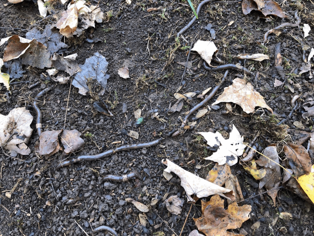 The worms only live for about 6 months, which is a very short lifespan compared to our more common earthworms, mostly dying off because of the colder temperatures of winter. Because they die off in November-December-ish, there’s a big increase in the nitrogen in the upper part of the soil and leaf litter, which is too late in the year for trees or bushes to take advantage of the nutrients, so, instead, the conditions favor changes in the bacterial composition of the soil which can be harmful to plants and soil animals.